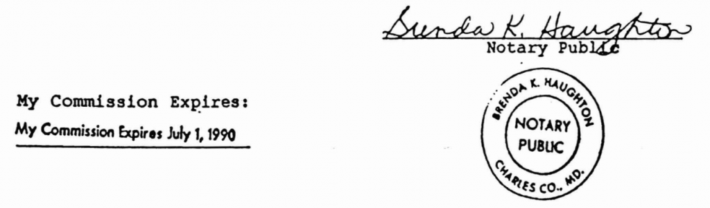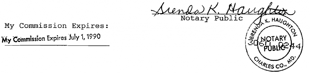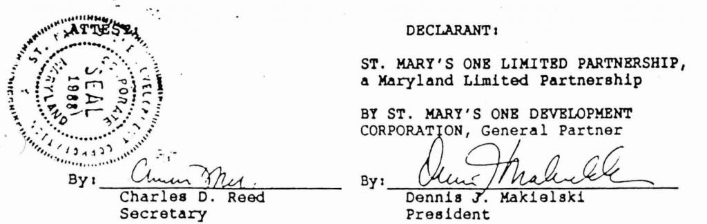 I HEREBY CERTIFY that on this 25th day of January, 1989, before me, the subscriber, a Notary Public in and for the State and County aforesaid, personally appeared Dennis J. Makielski, President of St. Mary’s One Development Corporation, authorized General Partner of St. Mary’s One Limited Partnership, a Maryland limited partnership, the Declarant, and that he as such President, being so authorized to do, executed the foregoing Declaration for the purposes therein contained, by signing in my presence, the name of the Partnership by himself as such President of the General Partner.
